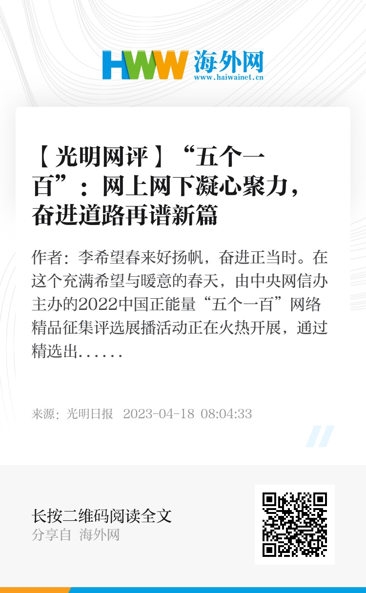 中国正能量“五个一百”网络精品征集评选展播活动已连续举办六届。每一届都在网络空间中弹奏出催人奋进的乐章。今年,是全面贯彻党的二十大精神的开局之年,是实施“十四五”规划承前启后的关键一年、为全面建设社会主义现代化国家奠定基础的重要一年,相信通过“五个一百”活动的开展,我们能够进一步在网上网下凝心聚力,在新征程的奋进道路上再谱新篇。(李希望)