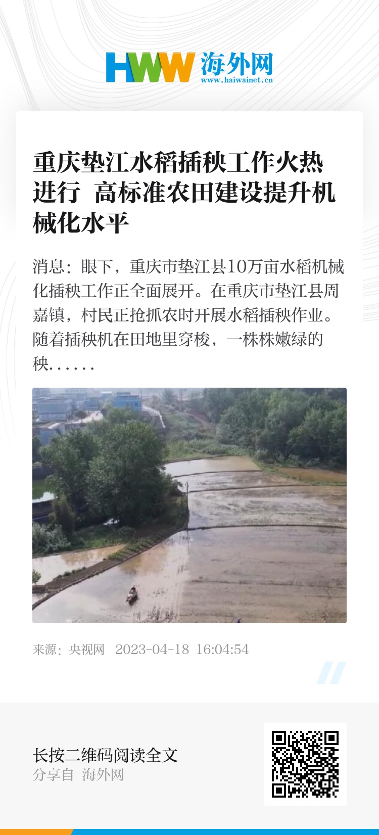 据了解,今年垫江县水稻种植面积约45.5万亩,其中10万亩稻田将由机械插秧完成,预计到5月下旬可完成水稻插秧工作。