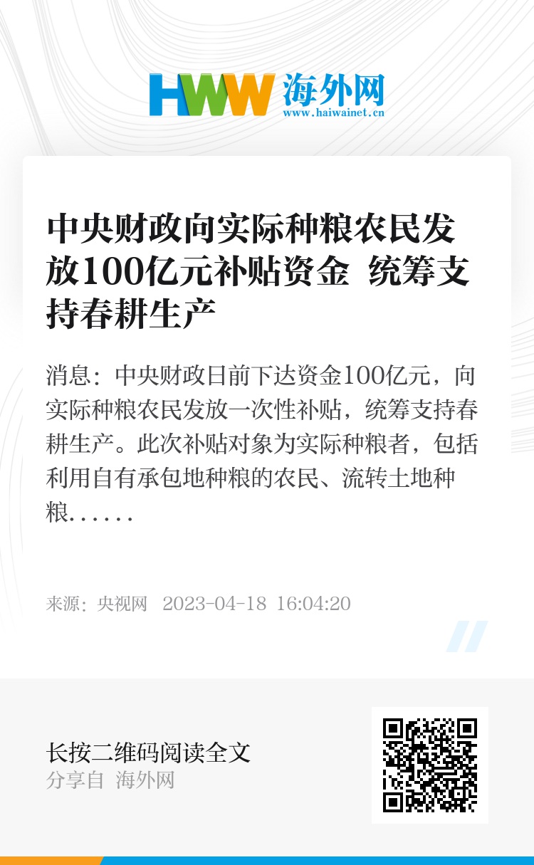 央视网消息:中央财政日前下达资金100亿元,向实际种粮农民发放一次性补贴,统筹支持春耕生产。