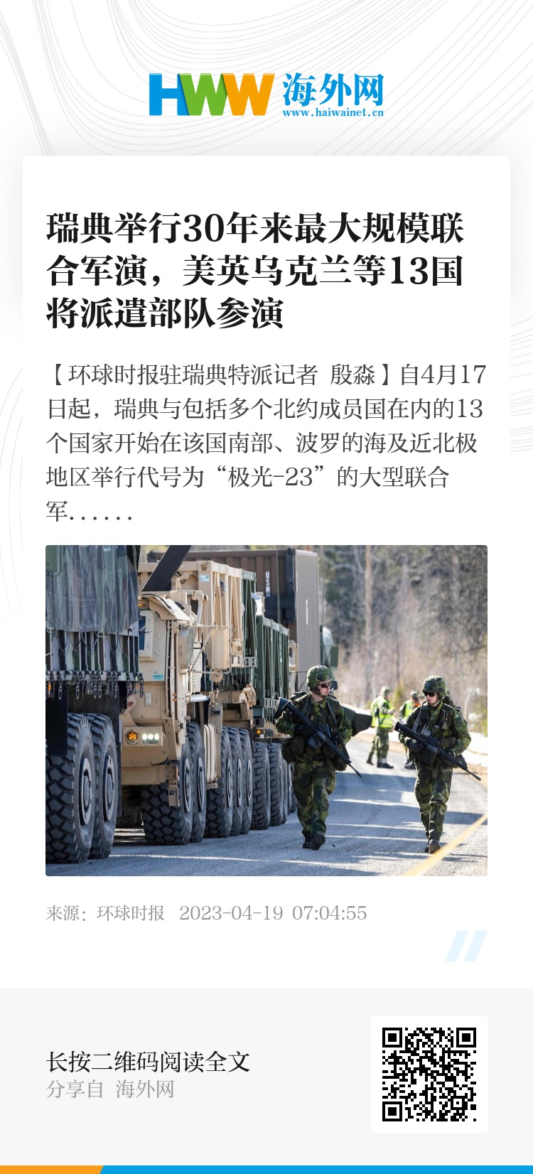 【环球时报驻瑞典特派记者 殷淼】自4月17日起,瑞典与包括多个北约成员国在内的13个国家开始在该国南部、波罗的海及近北极地区举行代号为“极光-23”的大型联合军演,这是30年来在该国领土上举行的最大规模军演。