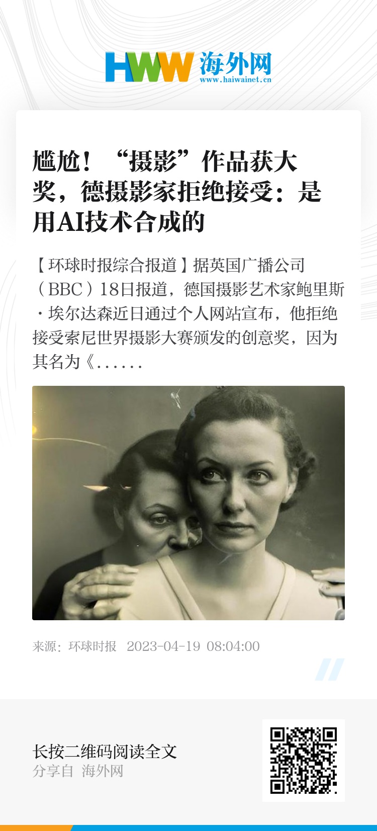 【环球时报综合报道】据英国广播公司(BBC)18日报道,德国摄影艺术家鲍里斯·埃尔达森近日通过个人网站宣布,他拒绝接受索尼世界摄影大赛颁发的创意奖,因为其名为《假性记忆:电工》的“摄影”作品是使用人工智能(AI)技术合成的。