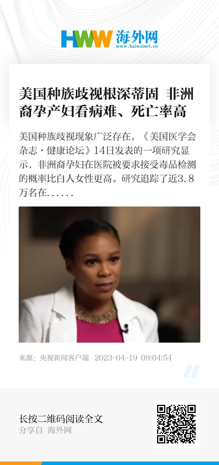 美国种族歧视现象广泛存在,《美国医学会杂志·健康论坛》14日发表的一项研究显示,非洲裔孕妇在医院被要求接受毒品检测的概率比白人女性更高。