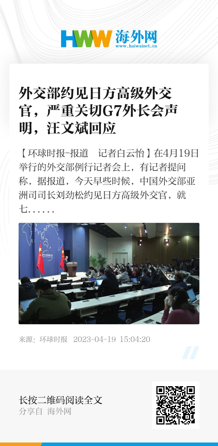 【环球时报-环球网报道 记者白云怡】在4月19日举行的外交部例行记者会上,有记者提问称,据报道,今天早些时候,中国外交部亚洲司司长刘劲松约见日方高级外交官,就七国集团(G7)外长会声明表达严重关切和强烈不满。中方对声明整体还是具体哪部分比如涉台部分表示不满?能否介绍情况?
