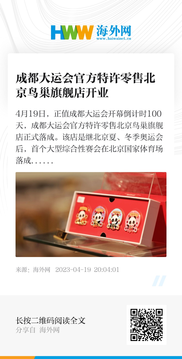 4月19日,正值成都大运会开幕倒计时100天,成都大运会官方特许零售北京鸟巢旗舰店正式落成。该店是继北京夏、冬季奥运会后,首个大型综合性赛会在北京国家体育场落成的唯一旗舰店,此店将作为成都大运会特许经营面向全国,展示成都形象,传递大运精神的重要平台和载体,目前已上架千余款特许新品,涵盖玩偶、工艺摆件、文具、体育用品、服饰首饰等诸多品类。图片来源:视觉中国