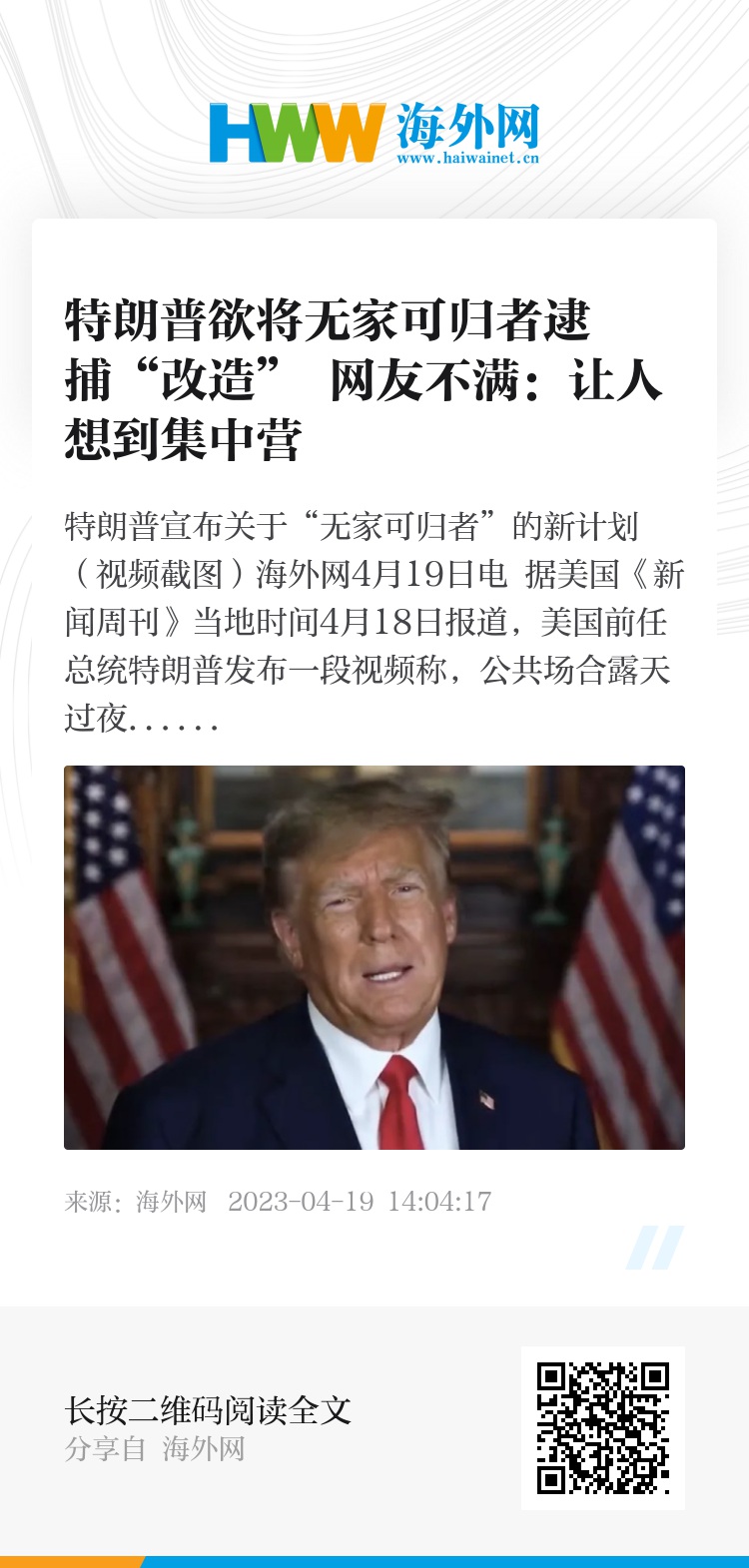 海外网4月19日电 据美国《新闻周刊》当地时间4月18日报道,美国前任总统特朗普发布一段视频称,公共场合露天过夜将被列为违法行为,街头流浪者会被逮捕或送往营地改造,网友评论“这让人联想到集中营”。