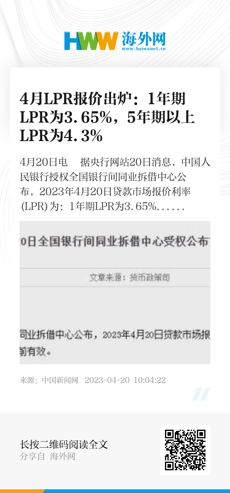 中新网4月20日电 据央行网站20日消息,中国人民银行授权全国银行间同业拆借中心公布,2023年4月20日贷款市场报价利率(LPR)为:1年期LPR为3.65%,5年期以上LPR为4.3%。以上LPR在下一次发布LPR之前有效。(中新财经)