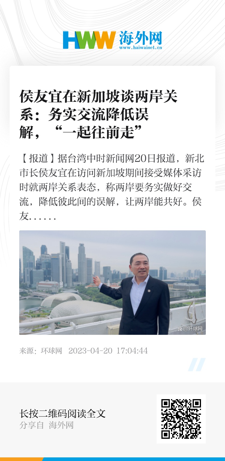 【环球网报道】据台湾中时新闻网20日报道,新北市长侯友宜在访问新加坡期间接受媒体采访时就两岸关系表态,称两岸要务实做好交流,降低彼此间的误解,让两岸能共好。