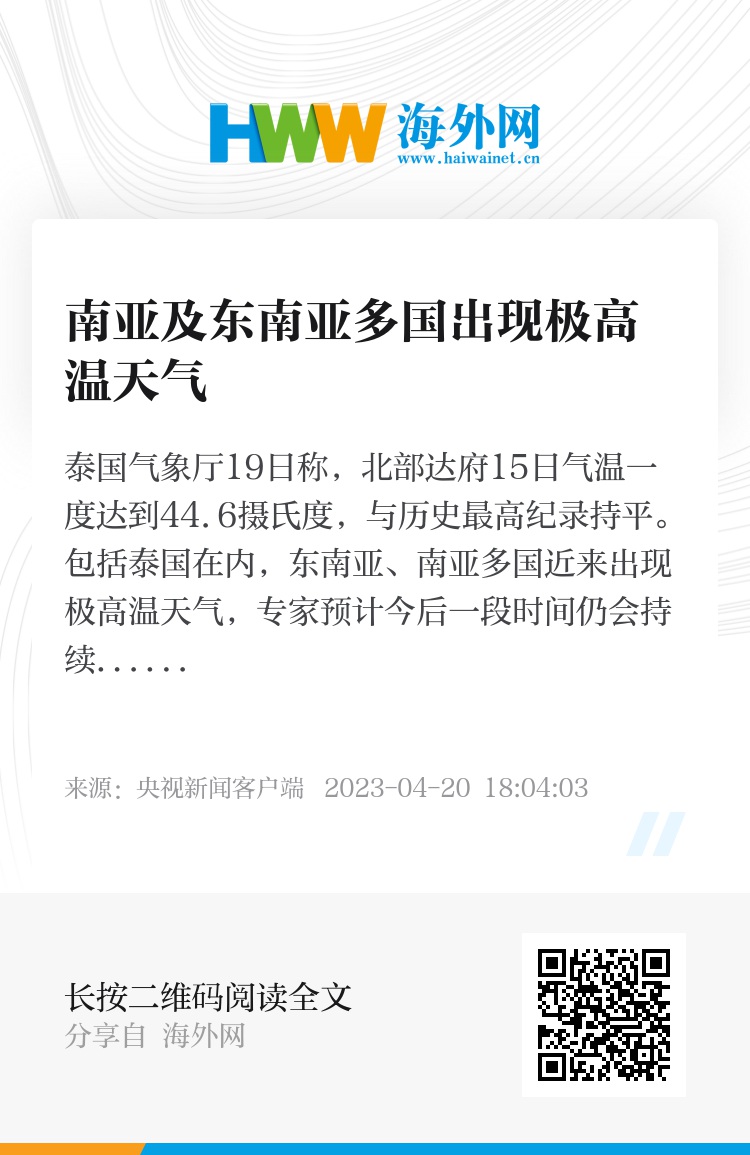 泰国气象厅19日称,北部达府15日气温一度达到44.6摄氏度,与历史最高纪录持平。包括泰国在内,东南亚、南亚多国近来出现极高温天气,专家预计今后一段时间仍会持续。