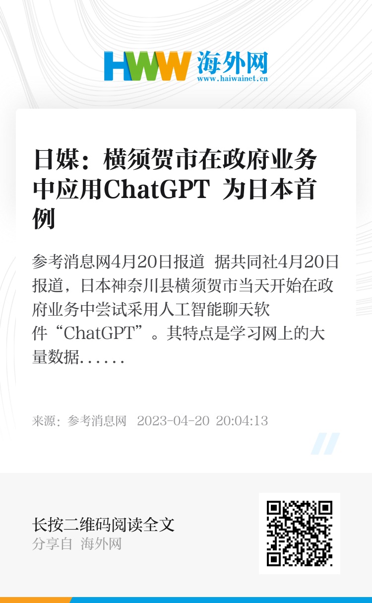 参考消息网4月20日报道 据共同社4月20日报道,日本神奈川县横须贺市当天开始在政府业务中尝试采用人工智能聊天软件“ChatGPT”。其特点是学习网上的大量数据,针对用户指示或提问给出回答。据悉,这种做法在日本全国地方政府中尚属首次。该市力争提升业务效率,在约1个月时间里用ChatGPT制成宣传文案并总结会议纪要,若确认有用将继续使用。