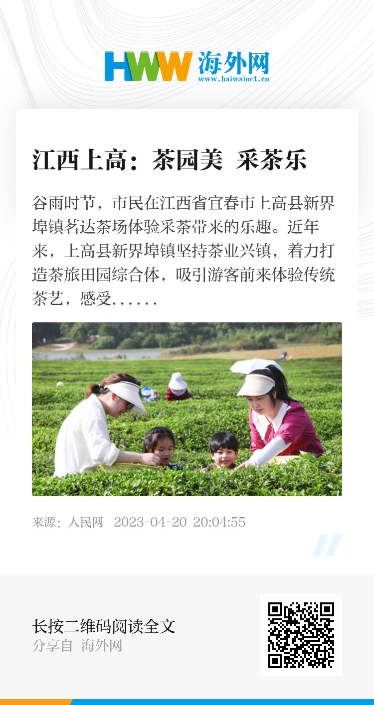 谷雨时节,市民在江西省宜春市上高县新界埠镇茗达茶场体验采茶带来的乐趣。近年来,上高县新界埠镇坚持茶业兴镇,着力打造茶旅田园综合体,吸引游客前来体验传统茶艺,感受中国传统茶文化,带动当地村民致富,助力乡村振兴。(毛思远、陈旗海)