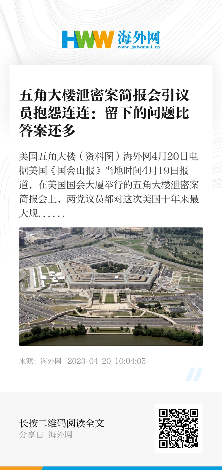 海外网4月20日电 据美国《国会山报》当地时间4月19日报道,在美国国会大厦举行的五角大楼泄密案简报会上,两党议员都对这次美国十年来最大规模的机密文件泄露事件提出了质疑和抱怨,议员一再呼吁政府更严格地限制工作人员接触机密的权限。