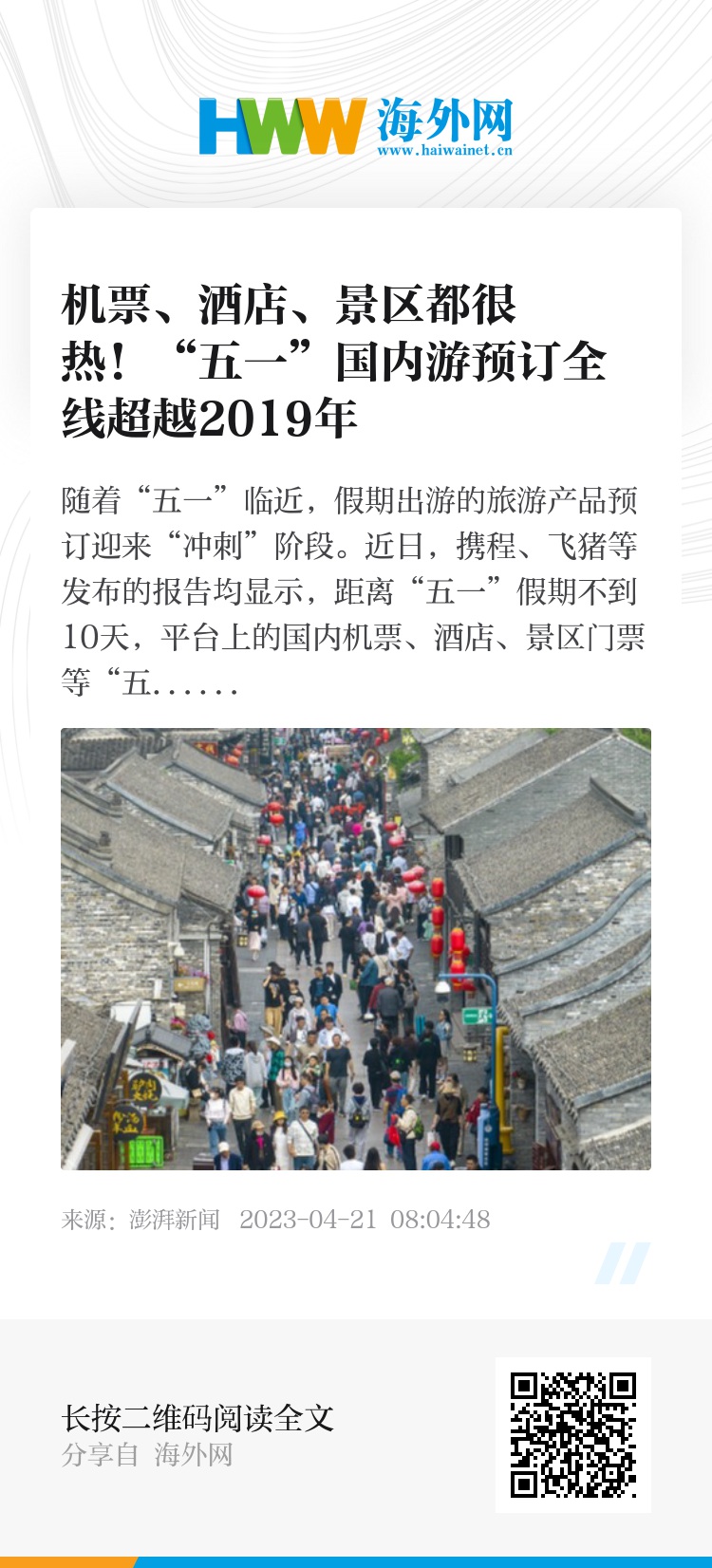 从热度来看,携程的数据显示,今年“五一”期间,出境机票搜索热度恢复至2019年同期的120%,出境游酒店搜索热度恢复至2019年的约70%。