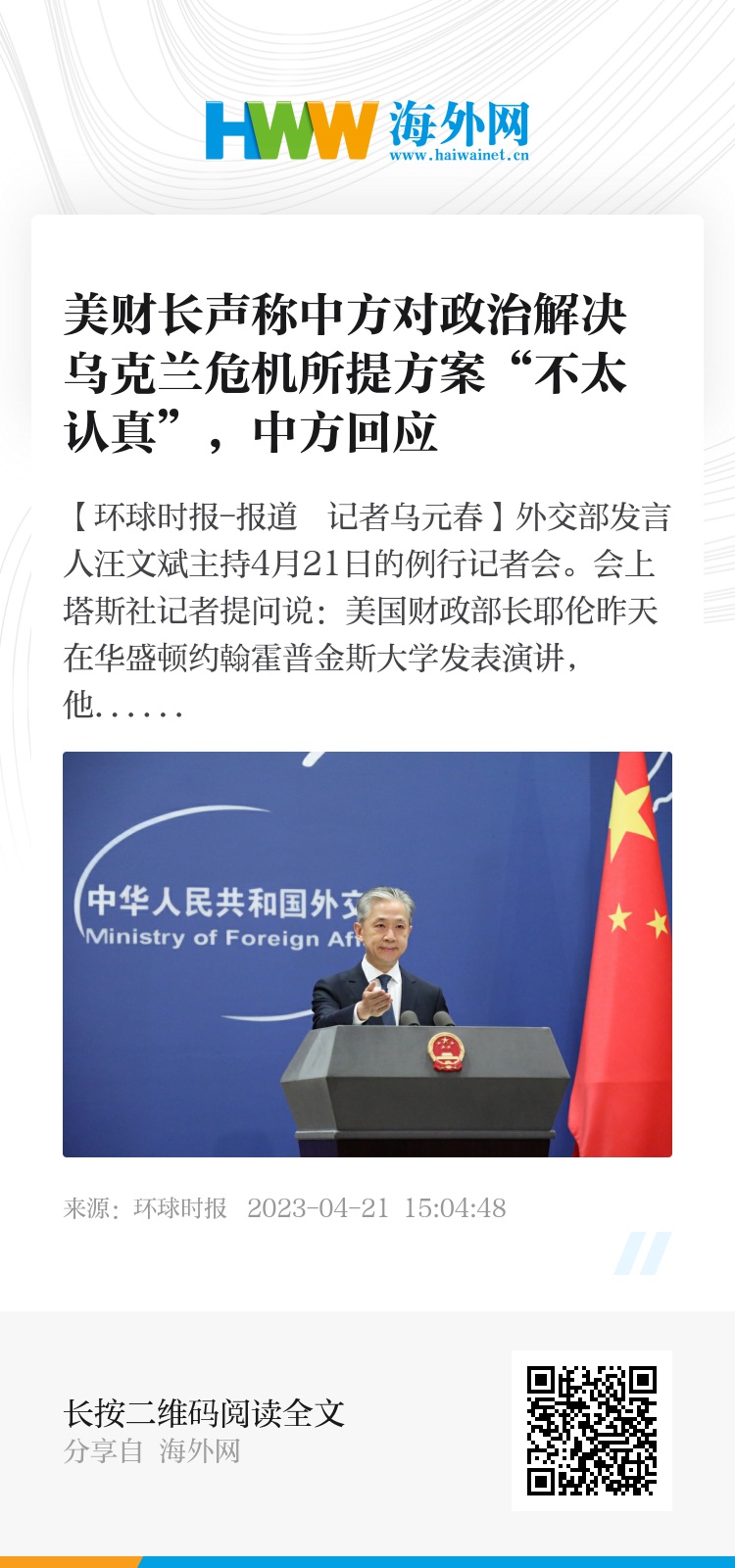 【环球时报-环球网报道 记者乌元春】外交部发言人汪文斌主持4月21日的例行记者会。会上塔斯社记者提问说:美国财政部长耶伦昨天在华盛顿约翰霍普金斯大学发表演讲,他表示中俄两国合作无上限、无止境,这层伙伴关系表明中方对政治解决乌克兰危机所提出的方案“不太认真”。中方对此有何评论?