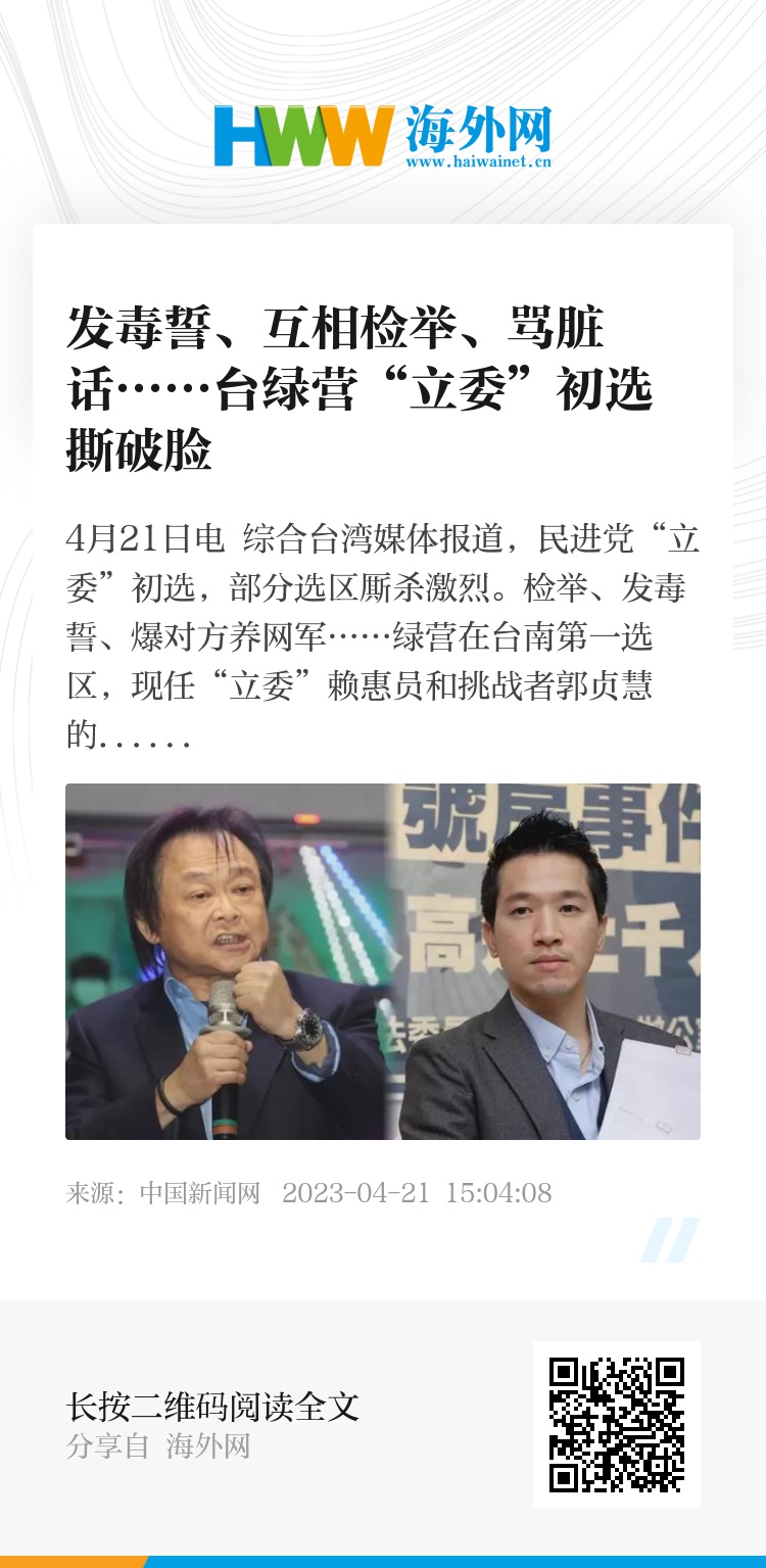 中新网4月21日电 综合台湾媒体报道,民进党“立委”初选,部分选区厮杀激烈。检举、发毒誓、爆对方养网军……绿营在台南第一选区,现任“立委”赖惠员和挑战者郭贞慧的初选竞争,已到刀刀见骨的程度。