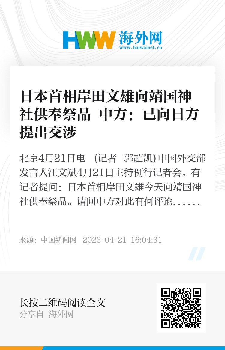 有记者提问:日本首相岸田文雄今天向靖国神社供奉祭品。请问中方对此有何评论?