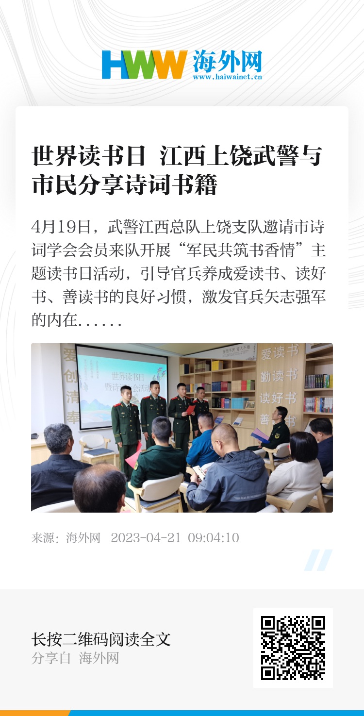 4月19日,武警江西总队上饶支队邀请市诗词学会会员来队开展“军民共筑书香情”主题读书日活动,引导官兵养成爱读书、读好书、善读书的良好习惯,激发官兵矢志强军的内在动力。图片来源:视觉中国