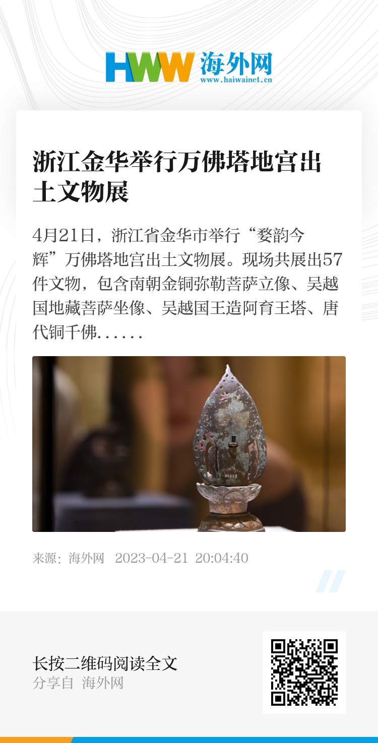 4月21日,浙江省金华市举行“婺韵今辉”万佛塔地宫出土文物展。现场共展出57件文物,包含南朝金铜弥勒菩萨立像、吴越国地藏菩萨坐像、吴越国王造阿育王塔、唐代铜千佛造像板等众多国宝级文物。1957年,浙江省文物管理委员会对金华市万佛塔地宫进行发掘,清理出土南朝至北宋时期的佛教遗物、供养物品183件。图片来源:胡肖飞/视觉中国