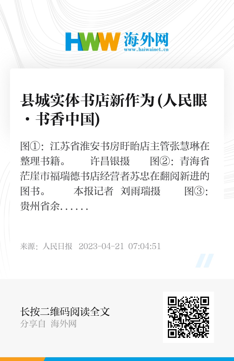 县城,一头连接城市,一头服务乡村。那些开在县城的书店,打通了许多城乡居民与书籍的“最后一公里”。在第二十八个世界读书日到来之际,本报记者走进江苏、贵州、青海的3家县城书店,倾听经营者讲述守护实体书店、留住芬芳书香的创新发展历程,感受读者与书籍、书店的相知相拥,品读县城里的墨韵书香。
