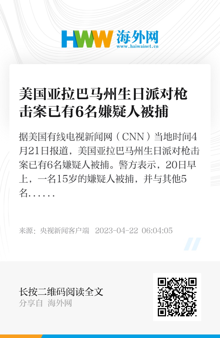 据美国有线电视新闻网(CNN)当地时间4月21日报道,美国亚拉巴马州生日派对枪击案已有6名嫌疑人被捕。
