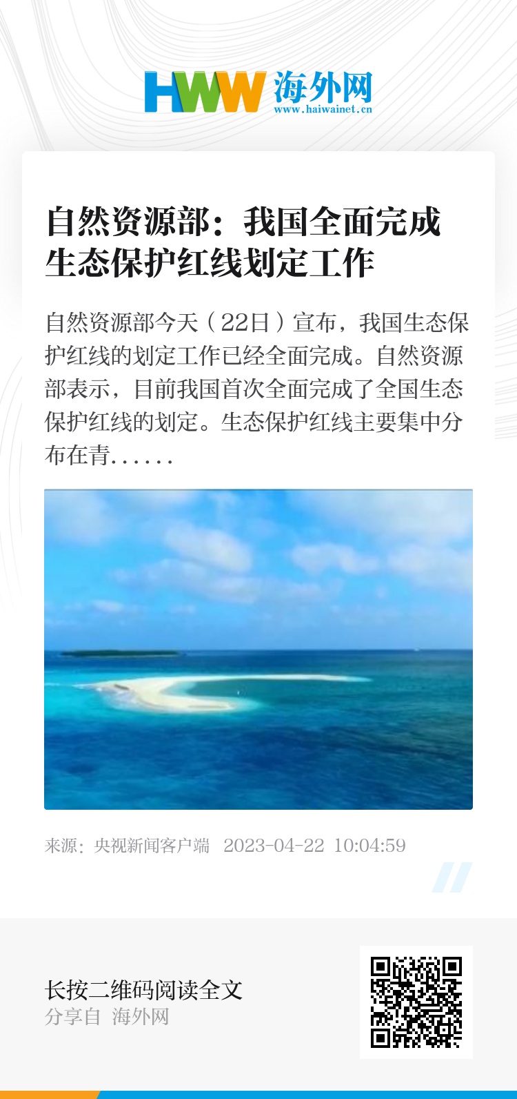 自然资源部今天(22日)宣布,我国生态保护红线的划定工作已经全面完成。