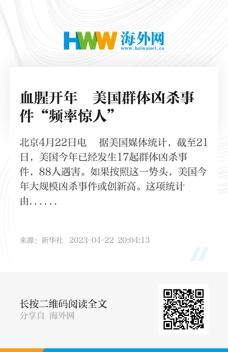 新华社北京4月22日电 据美国媒体统计,截至21日,美国今年已经发生17起群体凶杀事件,88人遇害。如果按照这一势头,美国今年大规模凶杀事件或创新高。