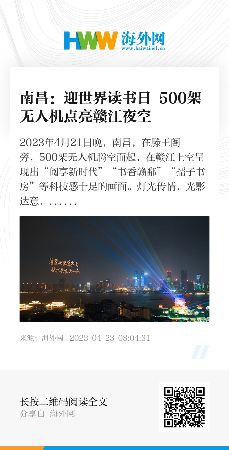 2023年4月21日晚,南昌,在滕王阁旁,500架无人机腾空而起,在赣江上空呈现出“阅享新时代”“书香赣鄱”“孺子书房”等科技感十足的画面。灯光传情,光影达意,伴着璀璨的一江两岸灯光秀,无人机编队把夜南昌点缀得更加炫酷,用科技与光影的魅力为首届江西省全民阅读大会造势,迎接4月23日“世界读书日”的到来。图源:视觉中国