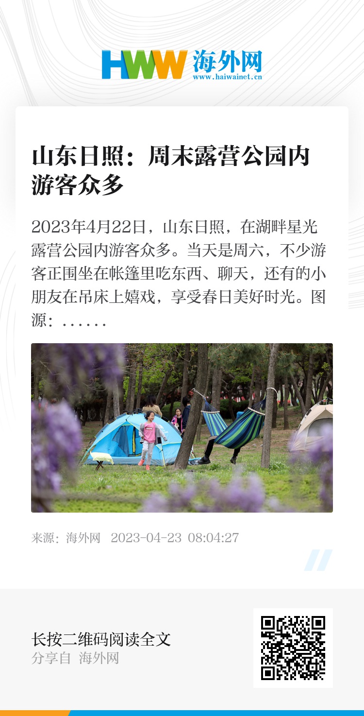 2023年4月22日,山东日照,在湖畔星光露营公园内游客众多。当天是周六,不少游客正围坐在帐篷里吃东西、聊天,还有的小朋友在吊床上嬉戏,享受春日美好时光。图源:视觉中国