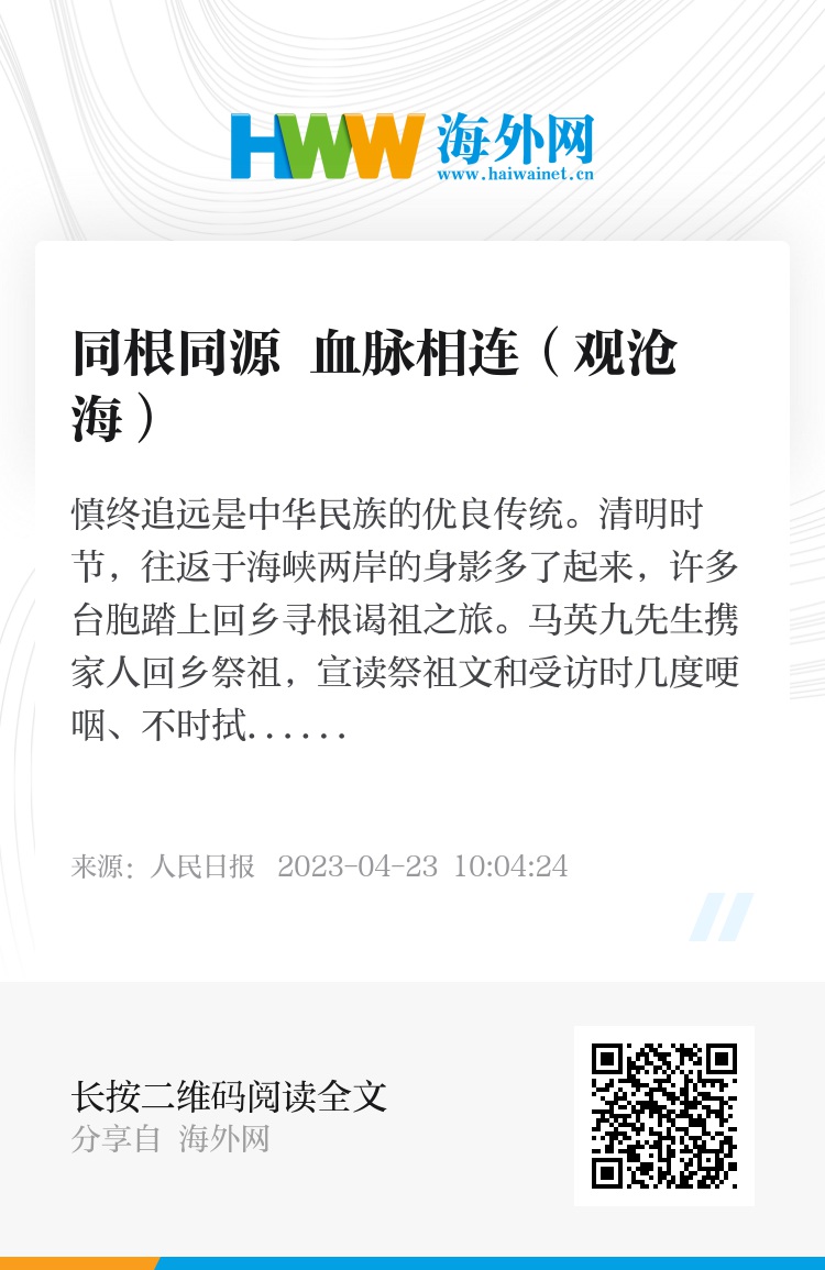 马英九先生携家人回乡祭祖,宣读祭祖文和受访时几度哽咽、不时拭泪的一幕让台湾民众深受感动;来自台北、桃园等台湾县市宗亲代表到湖北武汉参加第二届海峡两岸江夏文化研讨会,两岸宗亲共叙亲情、同怀先贤、共话乡谊;闽台携手完成的《开闽世家闽台源流志》第一期新书发布,讲述台北、台中和高雄开闽后人的故事,展示了海峡两岸同宗同源的历史渊源……这些动人故事和史实表明一个最基本的事实:两岸同胞一家亲,根植于同胞共同的血脉和精神,扎根于共同的历史和文化。这是与生俱来、浑然天成的,是不可磨灭的。两岸同胞同根同源、同文同宗,心之相系、情之相融,本是血脉相连的一家人。两岸走近、同胞团圆是两岸同胞的共同心愿,没有什么力量能把彼此割裂开来。