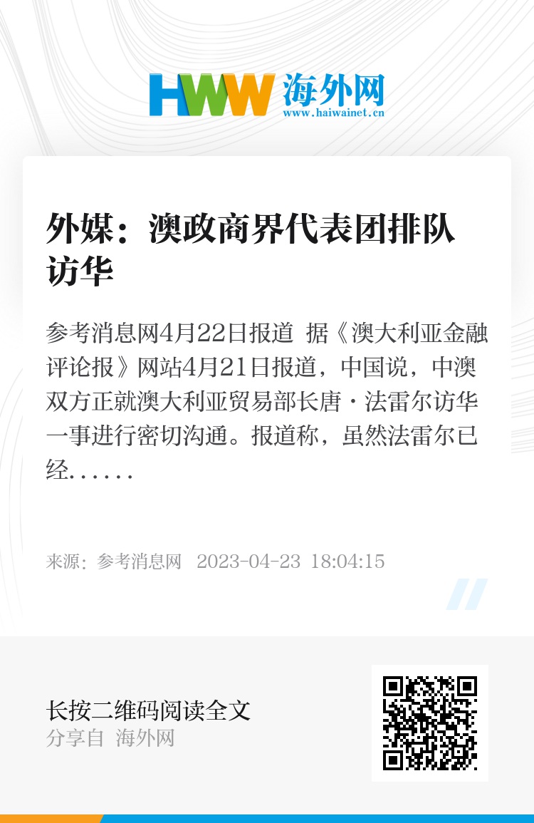 另据美国之音电台网站4月22日报道,澳地方政府与商界排队访华。