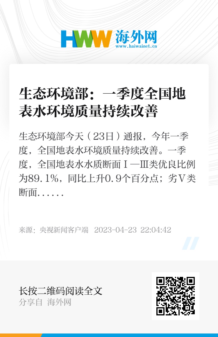 生态环境部今天(23日)通报,今年一季度,全国地表水环境质量持续改善。