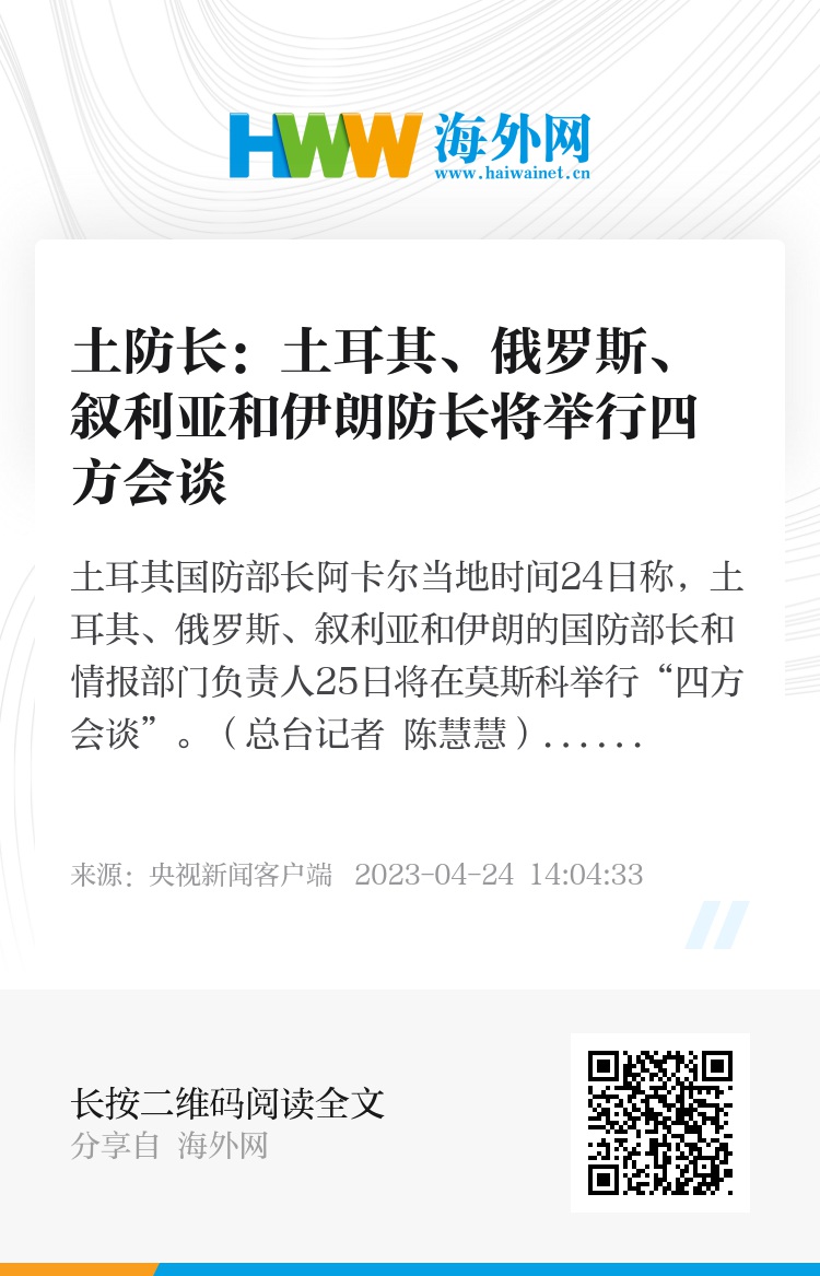 土耳其国防部长阿卡尔当地时间24日称,土耳其、俄罗斯、叙利亚和伊朗的国防部长和情报部门负责人25日将在莫斯科举行“四方会谈”。(总台记者 陈慧慧)