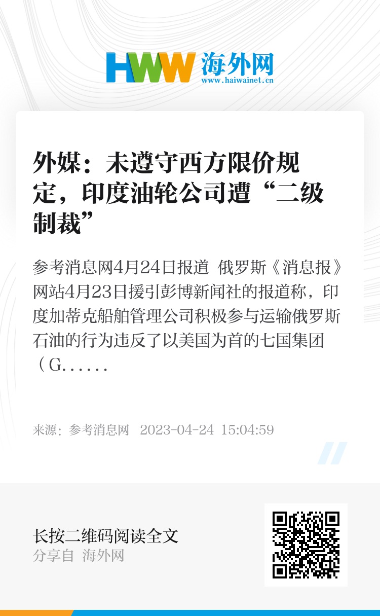 参考消息网4月24日报道 俄罗斯《消息报》网站4月23日援引彭博新闻社的报道称,印度加蒂克船舶管理公司积极参与运输俄罗斯石油的行为违反了以美国为首的七国集团(G7)的限价规定,因此失去了标配的行业保险。
