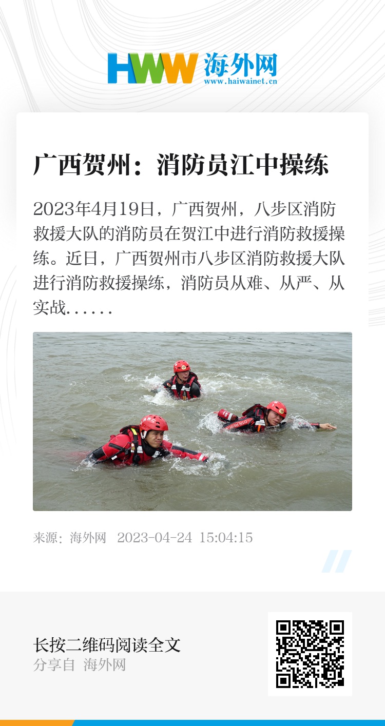 2023年4月19日,广西贺州,八步区消防救援大队的消防员在贺江中进行消防救援操练。近日,广西贺州市八步区消防救援大队进行消防救援操练,消防员从难、从严、从实战出发,在贺江中操练训练科目,以维护即将到来的“五一”假期期间群众的安全。图源:视觉中国