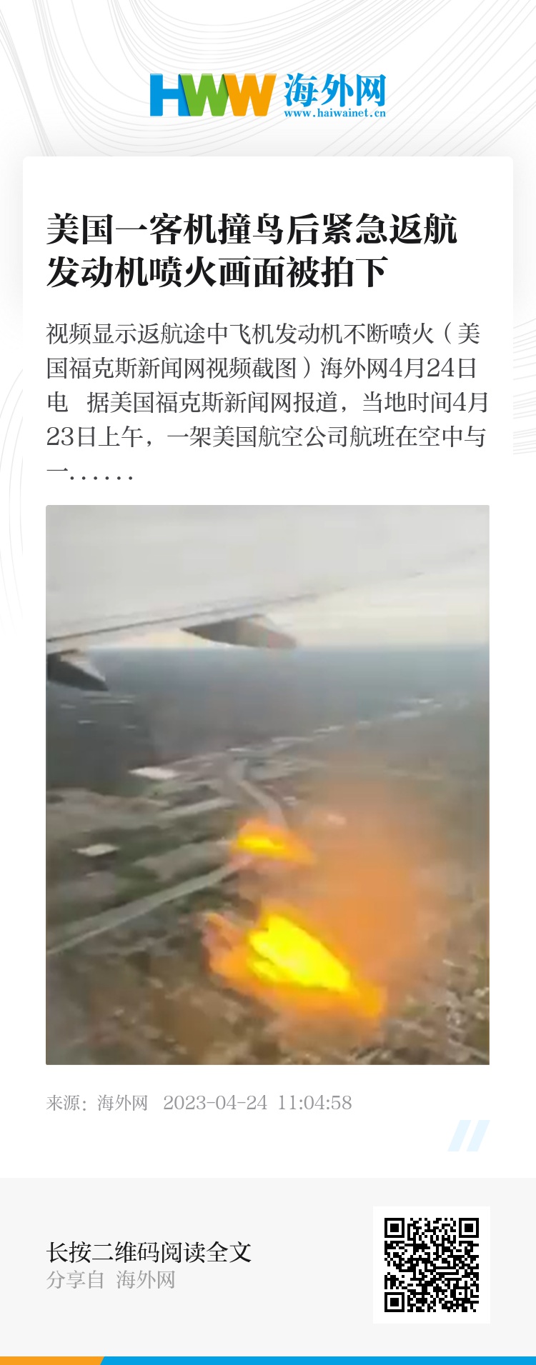 近期,美国另一家航空公司的航班也曾发生类似事故。4月11日,美国达美航空公司一架航班在飞行途中撞上一只鸟,被迫原路返航。(海外网 刘强 实习生 商睿文)