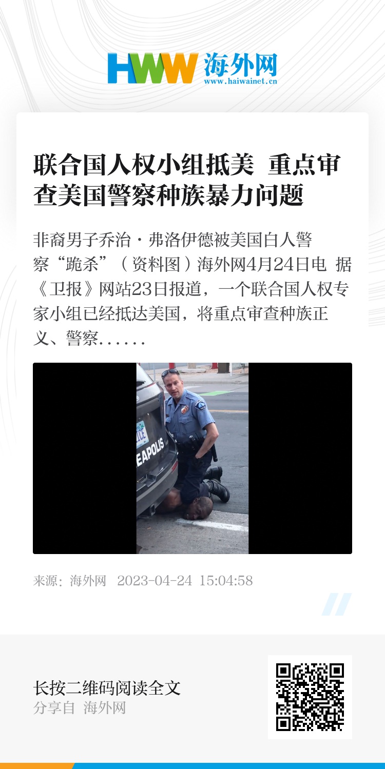 海外网4月24日电 据《卫报》网站23日报道,一个联合国人权专家小组已经抵达美国,将重点审查种族正义、警察暴力执法等问题。美国民众期待小组到来,并希望小组切实敦促美国政府履行人权保障义务。
