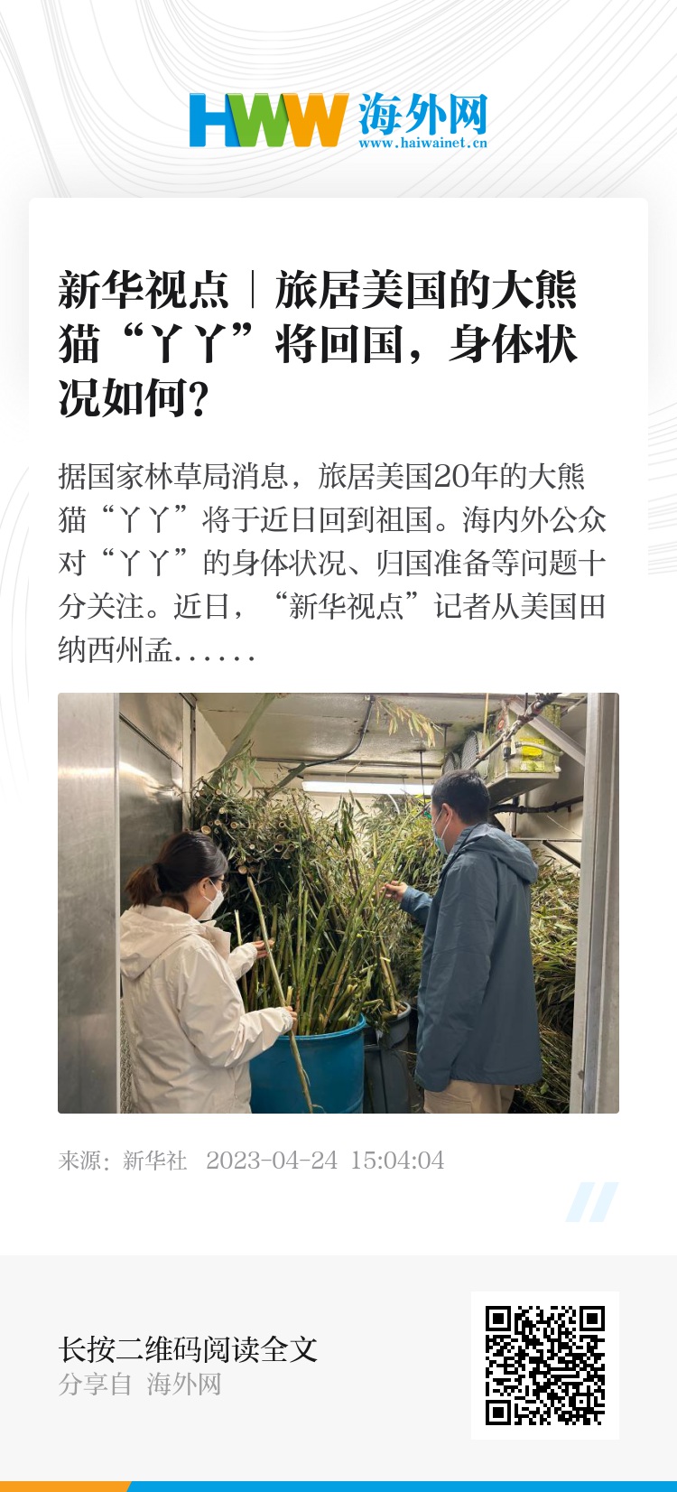 据国家林草局消息,旅居美国20年的大熊猫“丫丫”将于近日回到祖国。海内外公众对“丫丫”的身体状况、归国准备等问题十分关注。