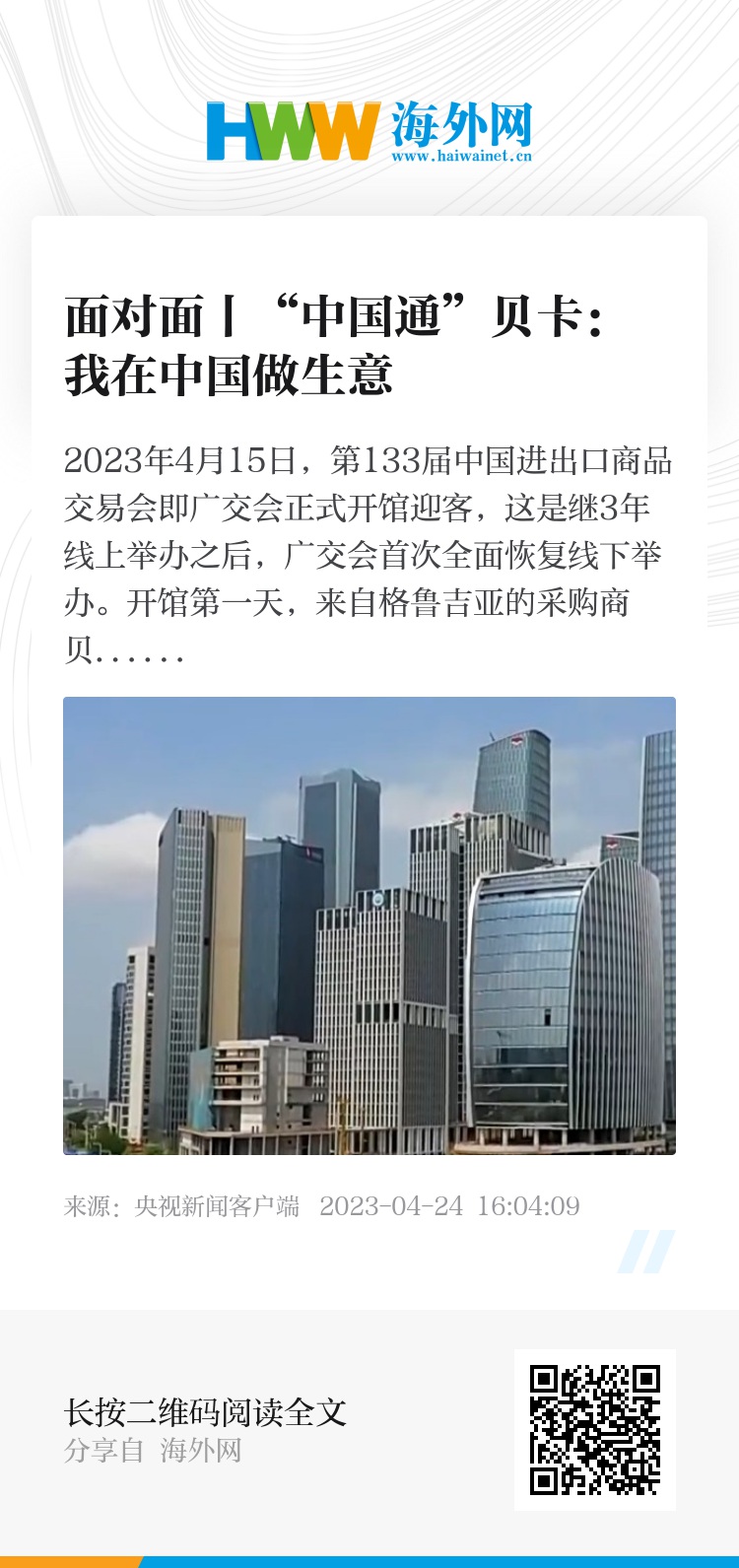2023年4月15日,第133届中国进出口商品交易会即广交会正式开馆迎客,这是继3年线上举办之后,广交会首次全面恢复线下举办。开馆第一天,来自格鲁吉亚的采购商贝卡·梅卡伯利兹早早进馆。《面对面》栏目专访了贝卡。