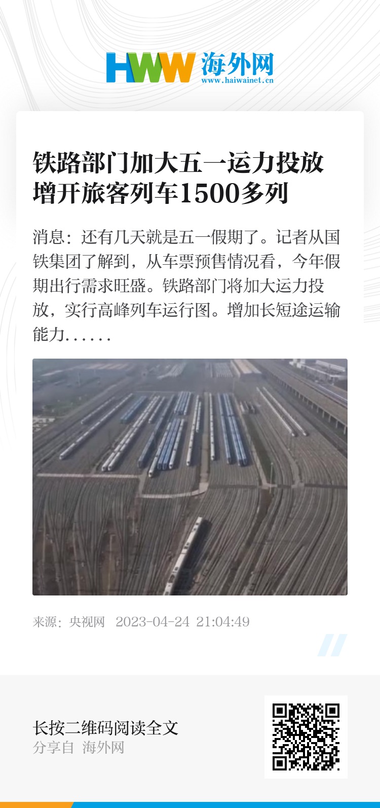 央视网消息:还有几天就是五一假期了。记者从国铁集团了解到,从车票预售情况看,今年假期出行需求旺盛。铁路部门将加大运力投放,实行高峰列车运行图。增加长短途运输能力,努力满足旅客出行需求。