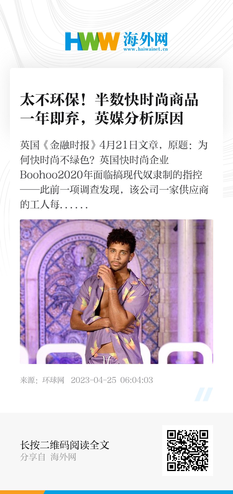 英国《金融时报》4月21日文章,原题:为何快时尚不绿色?英国快时尚企业Boohoo2020年面临搞现代奴隶制的指控——此前一项调查发现,该公司一家供应商的工人每小时工资仅为3.5英镑(英国23岁及以上工人最低时薪为10.42英镑)。去年,Boohoo宣布为解决这些问题而实施改革计划并取得成功。但英国竞争和市场管理局随后表示,正在对该品牌进行调查,因为它们只是在为自己“洗绿”。