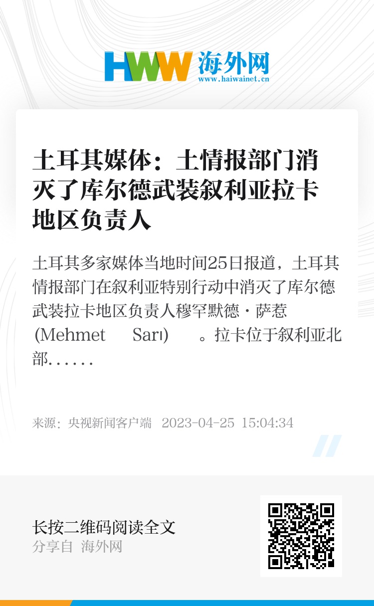 土耳其多家媒体当地时间25日报道,土耳其情报部门在叙利亚特别行动中消灭了库尔德武装拉卡地区负责人穆罕默德·萨惹 (Mehmet Sarı) 。