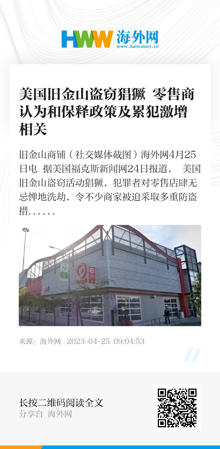 福克斯新闻网称,旧金山地区因严重的抢劫盗窃而遭到重创。美国零售联合会调查结果显示,旧金山、奥克兰分别是美国2020年及2021年盗窃第二严重的大都市地区,仅次于洛杉矶。被盗最多的商品是服装、电子产品及健康美容产品。零售商报告称,与2022年相比,犯罪者的暴力程度也有所增加。此外,54.6%的零售商认为,犯罪活动猖獗,和美国的保释政策改革及多次犯罪人员激增息息相关。(海外网/王珊宁)