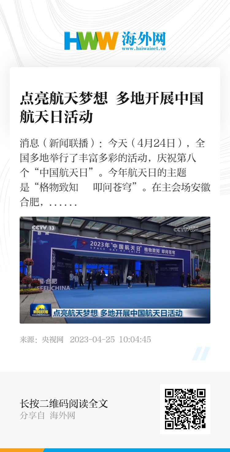 央视网消息(新闻联播):今天(4月24日),全国多地举行了丰富多彩的活动,庆祝第八个“中国航天日”。