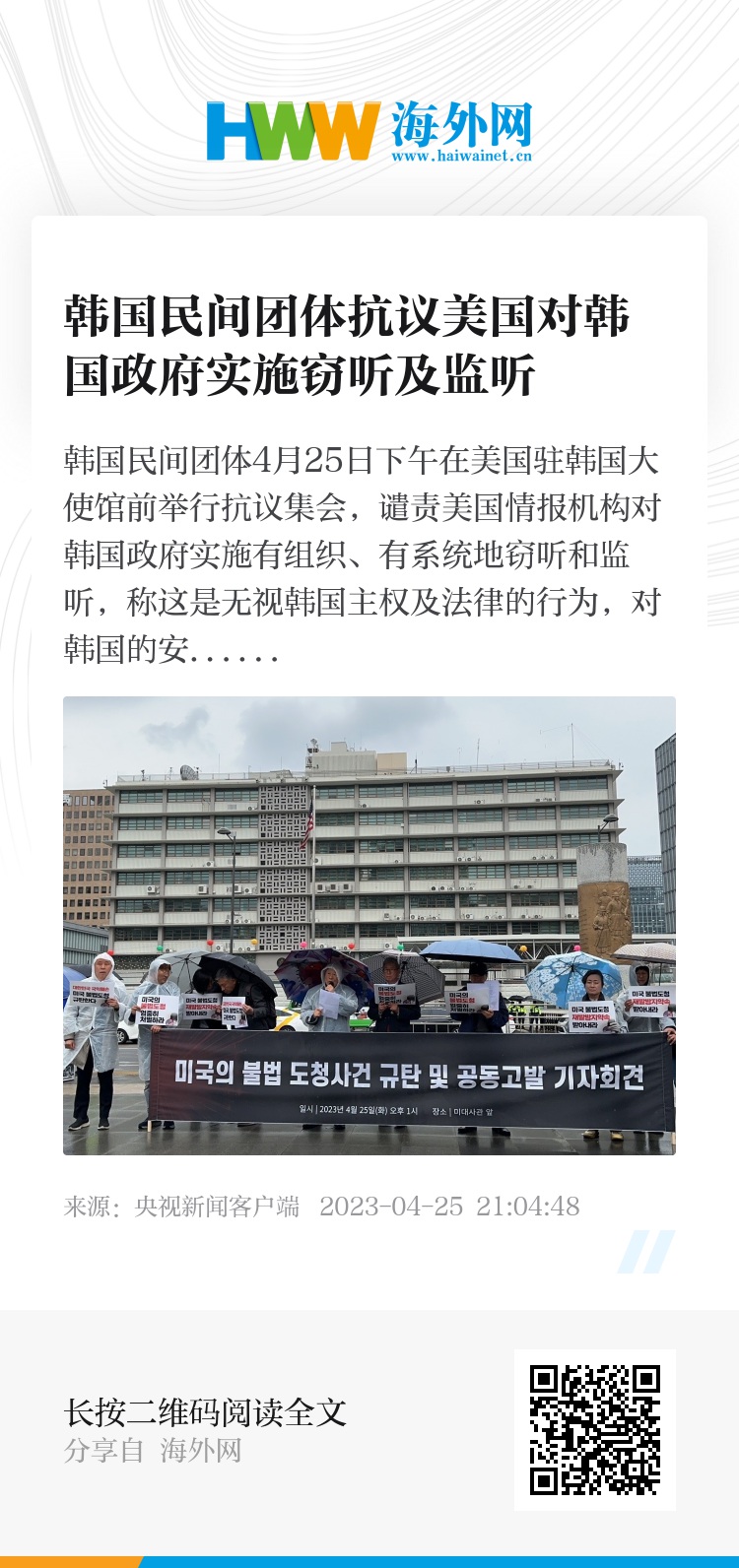 韩国民间团体4月25日下午在美国驻韩国大使馆前举行抗议集会,谴责美国情报机构对韩国政府实施有组织、有系统地窃听和监听,称这是无视韩国主权及法律的行为,对韩国的安保造成了严重侵害。
