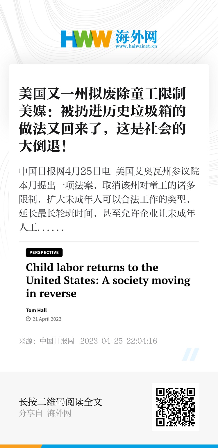 文章指出,这项法案以所谓推动该州童工法律“现代化”为由,实际上是美国社会大规模倒退的开端。作为这个世界上最富裕的国家,美国孜孜不倦地在“民主”和“人权”问题上大肆说教,但雇佣童工这个曾被认为至少在发达的工业化国家进了历史垃圾箱的野蛮做法,居然又回来了。