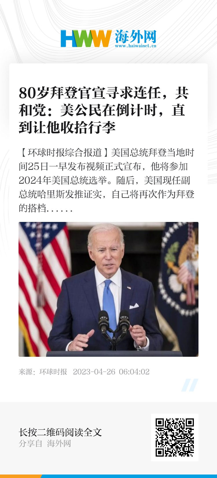 【环球时报综合报道】美国总统拜登当地时间25日一早发布视频正式宣布,他将参加2024年美国总统选举。随后,美国现任副总统哈里斯发推证实,自己将再次作为拜登的搭档竞选美国副总统。法新社称,拜登正式宣布竞选连任,意味着他将以创纪录的80岁高龄投入到一场新的激烈竞选中,若成功当选将再次刷新“美国最年长总统”的年龄纪录。目前,民主党内宣布参选的仅有两人,分别是美国前总统约翰·肯尼迪的侄子小罗伯特·肯尼迪,以及畅销书作家玛丽安娜·威廉姆森。美国舆论认为,这两人都无法对拜登构成威胁。多家美国媒体25日报道认为,“(2024年大选)很可能演变为2020年那样的,拜登和特朗普的再次较量”。