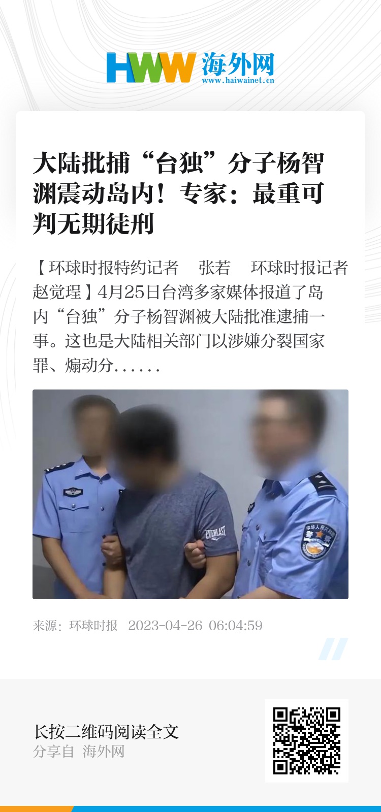【环球时报特约记者 张若 环球时报记者 赵觉珵】4月25日台湾多家媒体报道了岛内“台独”分子杨智渊被大陆批准逮捕一事。这也是大陆相关部门以涉嫌分裂国家罪、煽动分裂国家罪依法追究台湾“台独”分子刑事责任的第一起案件。