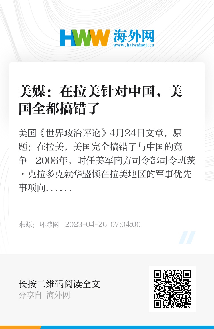 美国《世界政治评论》4月24日文章,原题:在拉美,美国完全搞错了与中国的竞争 2006年,时任美军南方司令部司令班茨·克拉多克就华盛顿在拉美地区的军事优先事项向国会作证。他的发言主要涉及对“极端伊斯兰团体”在拉美活动的担忧。关于中国的内容只有一段,且出现在较后的第26页。上个月,现任南方司令部司令劳拉·理查德森向美国国会提交一份态势声明时,只字未提“基地”组织或其他恐怖组织。相反,这份本来是关注拉美的文件,开篇就讨论起“与中国的战略竞争——决定性的十年”。有关美国在该地区政策与中国关系的问题贯穿整个文件。