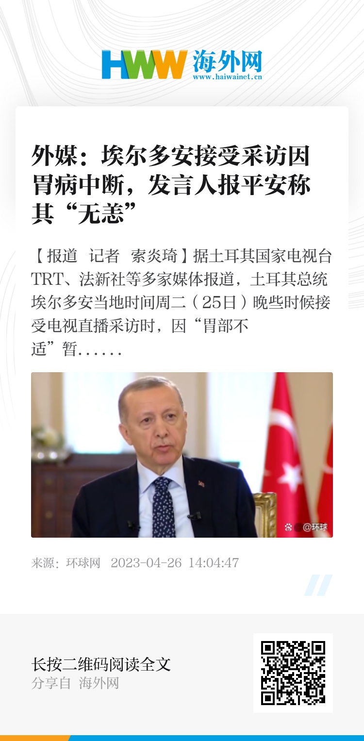 【环球网报道 记者 索炎琦】据土耳其国家电视台TRT、法新社等多家媒体报道,土耳其总统埃尔多安当地时间周二(25日)晚些时候接受电视直播采访时,因“胃部不适”暂时中断了采访,随后在返回现场后进行了道歉。事后,土耳其总统府发言人易卜拉欣·卡林在社交平台报平安,称埃尔多安“身体无恙”。