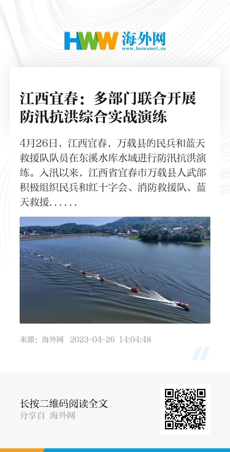 4月26日,江西宜春,万载县的民兵和蓝天救援队队员在东溪水库水域进行防汛抗洪演练。入汛以来,江西省宜春市万载县人武部积极组织民兵和红十字会、消防救援队、蓝天救援队队员在东溪水库水域开展防汛抗洪综合实战演练。演练围绕冲锋舟水上编队、编队搜索、转移受灾群众、运送救灾物资等课目进行,进一步提升民兵和蓝天救援队队员的防汛应急处置和水上抢险救灾能力。图片来源:邓龙华/视觉中国
