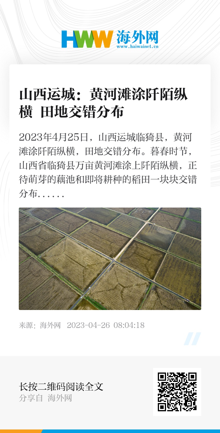 2023年4月25日,山西运城临猗县,黄河滩涂阡陌纵横,田地交错分布。暮春时节,山西省临猗县万亩黄河滩涂上阡陌纵横,正待萌芽的藕池和即将耕种的稻田一块块交错分布,航拍镜头下美丽如画,生机盎然。图源:视觉中国